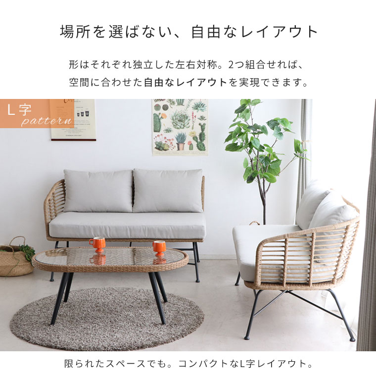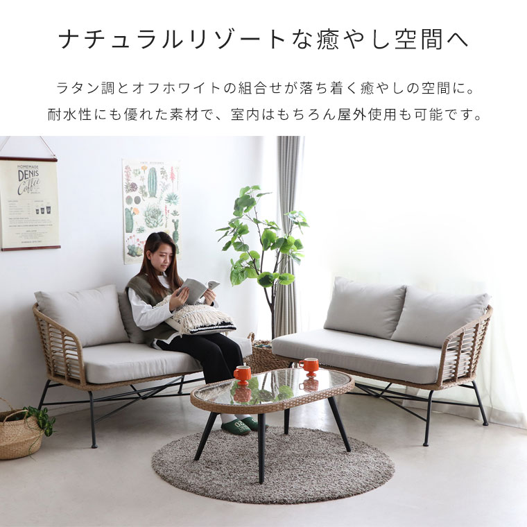 クッション部分:カバーリング仕様(洗濯可) 説明 ラタンとオフホワイトの組合せがナチュラルかつリゾートチックな癒しの空間を作り出すリゾネア2Pソファ。