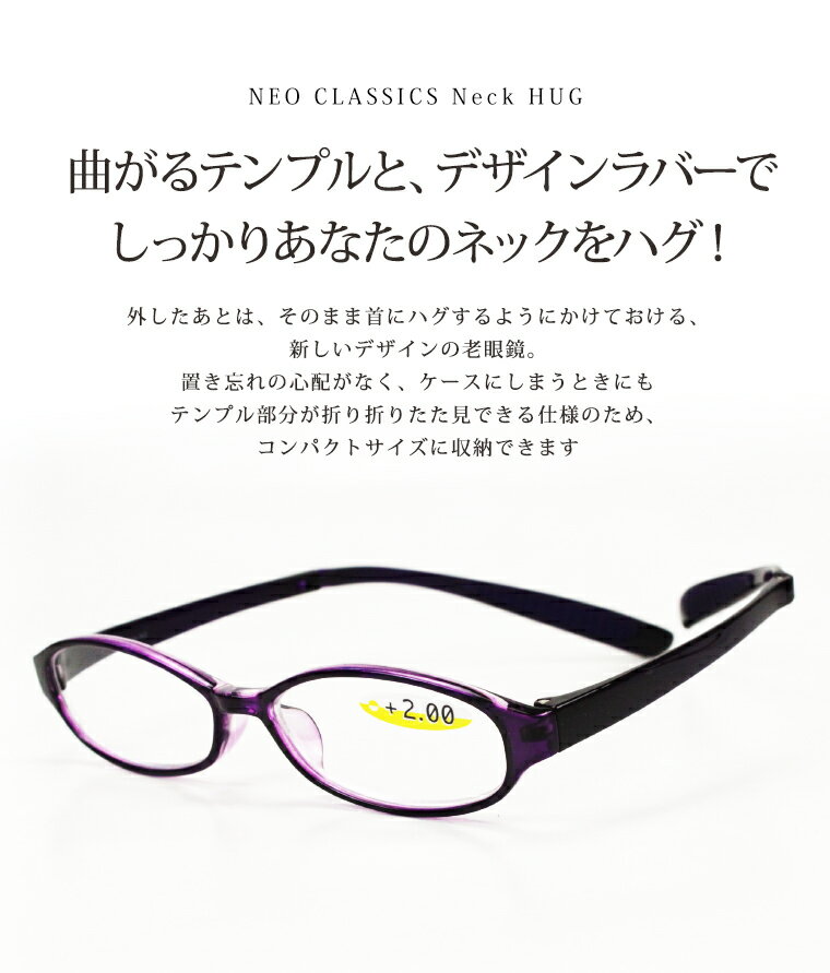 NEO CLASSIC ネックハグ 老眼鏡 首かけ 折りたたみ曲がるテンプルと、デザインラバーでしっかりあなたのネックをハグ!外した後は、そのまま首にハグするようにかけておける、新しいデザインの老眼鏡。