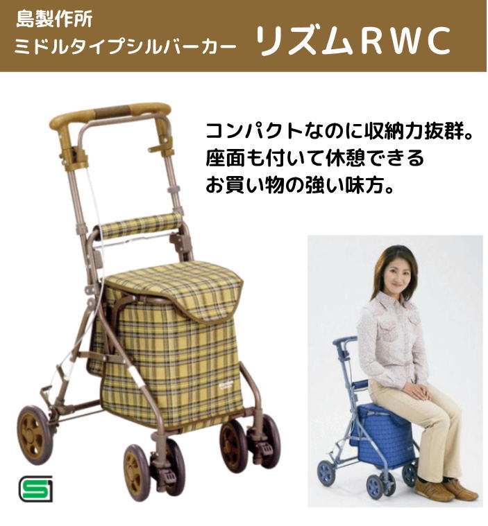 製品仕様 商品名 リズムRWC 内容量 1台 素材・原材料 ○本体部分:アルミパイプ(粉体塗装) ○タイヤ:EVA硬質発泡車輪 ○ホイル:P.P ○バッグ:ビニールレザー サイズ 幅46.5cm×奥行52cm×高さ84〜91.5cm 座面寸法:幅27×奥行23×高さ48cm 折りたたみ時:奥行き28cm 前輪:13cm/後輪:15cm 重量 約4.4kg タイヤ (左右60°+固定の2WAY 耐荷重 80kg バッグ容量 14L 商品説明 大きな収納バッグ、買い物カゴをのせることもできます ○手元駐車ストッパー ストッパーを上に上げると後輪がロックされ、下に降ろすとロックが解除されます。